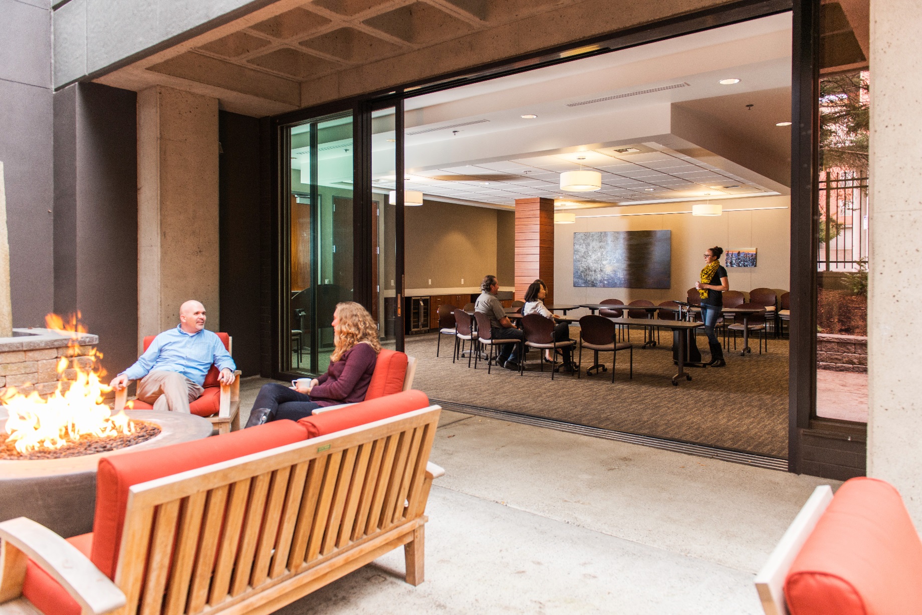 - Gas firepit with comfortable seating in the courtyard adds a cozy feeling to events